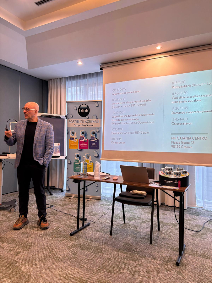 Durante la giornata formativa presentata dall’optometrista lecchese Matteo Malattia, si sono susseguite sessioni teoriche sulla composizione della lacrima e pratiche tramite l’utilizzo degli ultimissimi strumenti di SBM Sistemi, finalizzati appunto all’analisi del film lacrimale. Non sono mancati i sostituti lacrimali ed i prodotti della linea Blink, presentati dalla professional relations specialist B+Lomb Silvia Zanarella